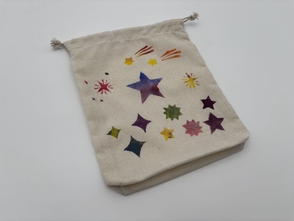 巾着袋にステンシルシールと絵具を使って 模様をつけるクラフトです。完成した巾着は小物入れやお土産に