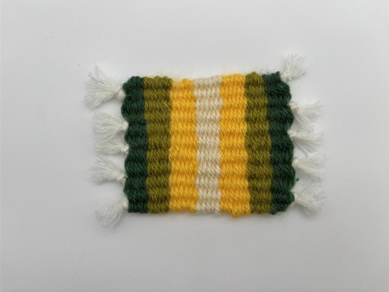 織機を使って毛糸のコースターを編みましょう。 色の組み合わせや編み方によって様々な模様が できるので、自分だけのコースターを作れます。