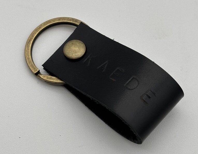 レザーに刻印棒を使って、名前、イニシャル、数字などを自由に刻印できる手作りレザーキーホルダーです。