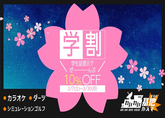 2026年2月7日~3月30日(月)の期間、学生証提示で、カラオケ、シュミレーションゴ...