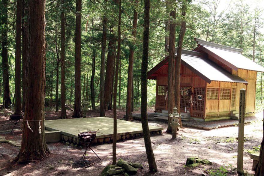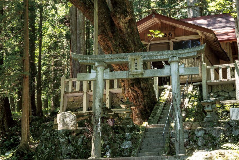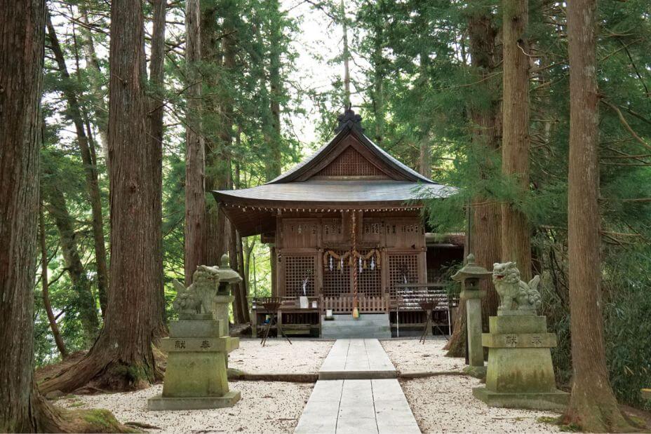 三海神を祀る神社。樹齢2000年とも言われる日本杉(やまとすぎ)や日本武尊の腰掛岩などがあり、古代東山道の雰囲気を残している。