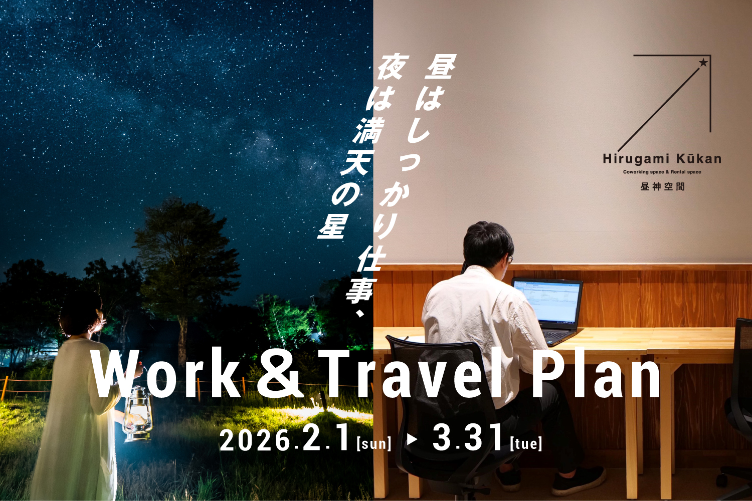 レンタルスペース昼神空間では、2026年2月1日(日)から3月31日(火)の期間、「天空の楽園 ナイトツアー」・「日本一の星空 浪合パーク」で使える利用券がついたお得な「Work&Travelプラン」を販売いたします。