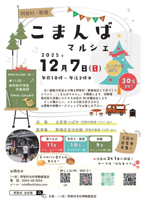 古い建物や街並みが残る阿智村・駒場地区で2軒の古民家つぼやと亀屋、駒場地区自治会館、旧銭湯「玉の湯」、そして玉の湯~亀屋までの通り沿いを会場に手作りイベント「こまんばマルシェ」を開催します!