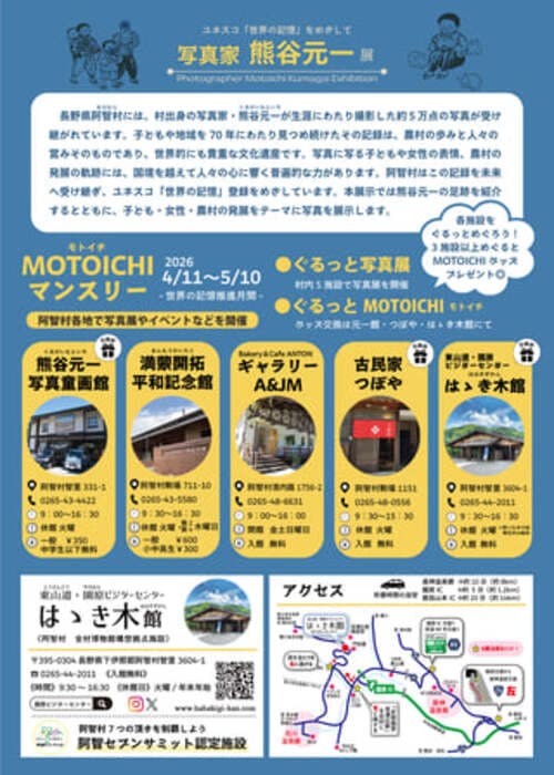 村出身の写真家・熊谷元一(くまがいもといち)が農村の歩みと人々の営みを記録し続けた約5万点の写真は、世界的にも貴重な文化遺産です。阿智村はこの記録を未来へ受け継ぎ、ユネスコ「世界の記録」登録をめざしています。本展示では熊谷元一の足跡を紹介するとともに、子ども・女性・農村の発展をテーマに写真を展示します。