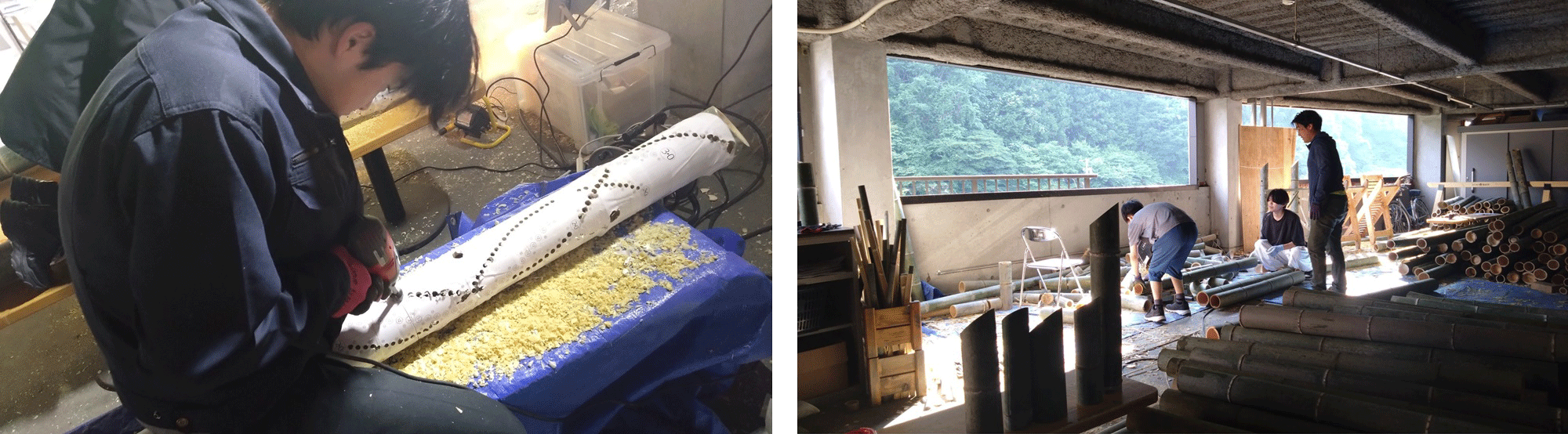 伐採した竹を切断して、ドリルを使いひとつひとつ穴をあけていきます。