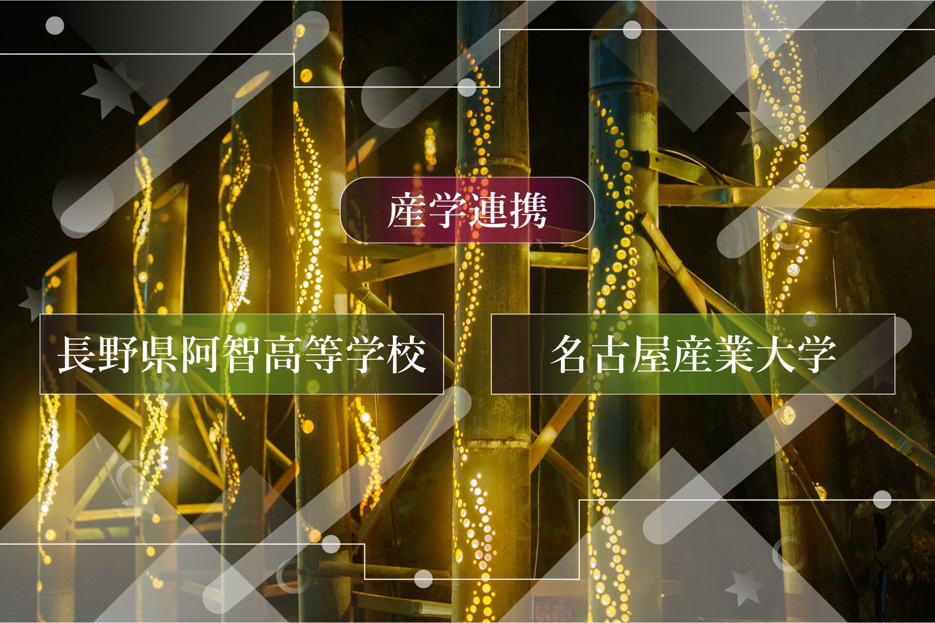 日本一の星空「⻑野県阿智村」では2024年7月7日(日)〜8月31日(土)までの期間、昼神温泉を中心 に村内各所で竹あかりが煌めく「日本一の星空 阿智村七夕まつり」を開催いたします。産学連携の取組 みとして、期間中展示される竹あかりを、名古屋産業大学現代ビジネス学部の学生、⻑野県阿智高等学 校地域政策コースの学生が、株式会社阿智昼神観光局、昼神温泉旅館⻘年部などの組織と協力して製作 いたしました。